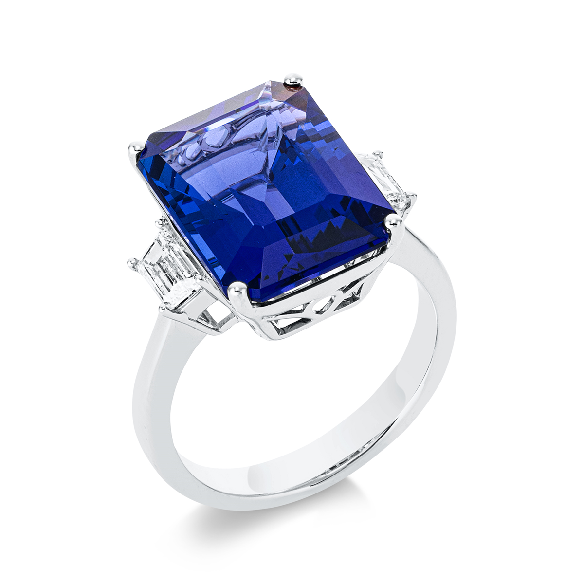 Ring 18 kt WG, 2 Trapeze 0,56 ct, TW-si, 1 Tansanit 10,45 ct blau, Weite:54