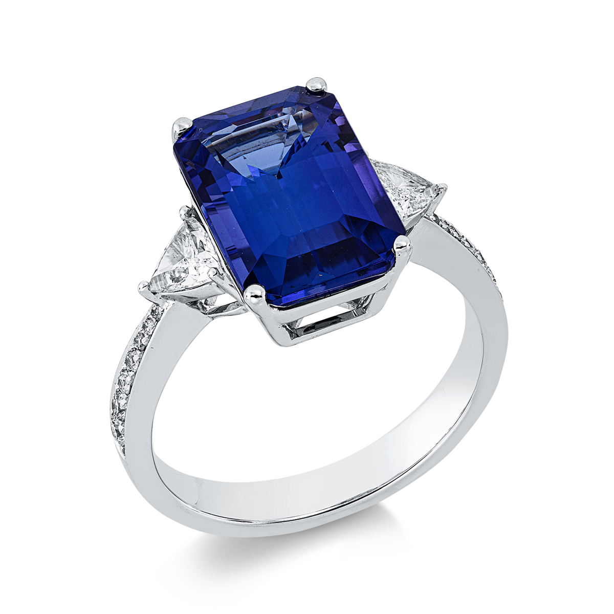 Ring 18 kt WG, 2 Triangel 0,38 ct, TW-si, 14 Brillanten 0,13 ct, TW-si, 1 Tansanit 5,41 ct blau, Weite:54