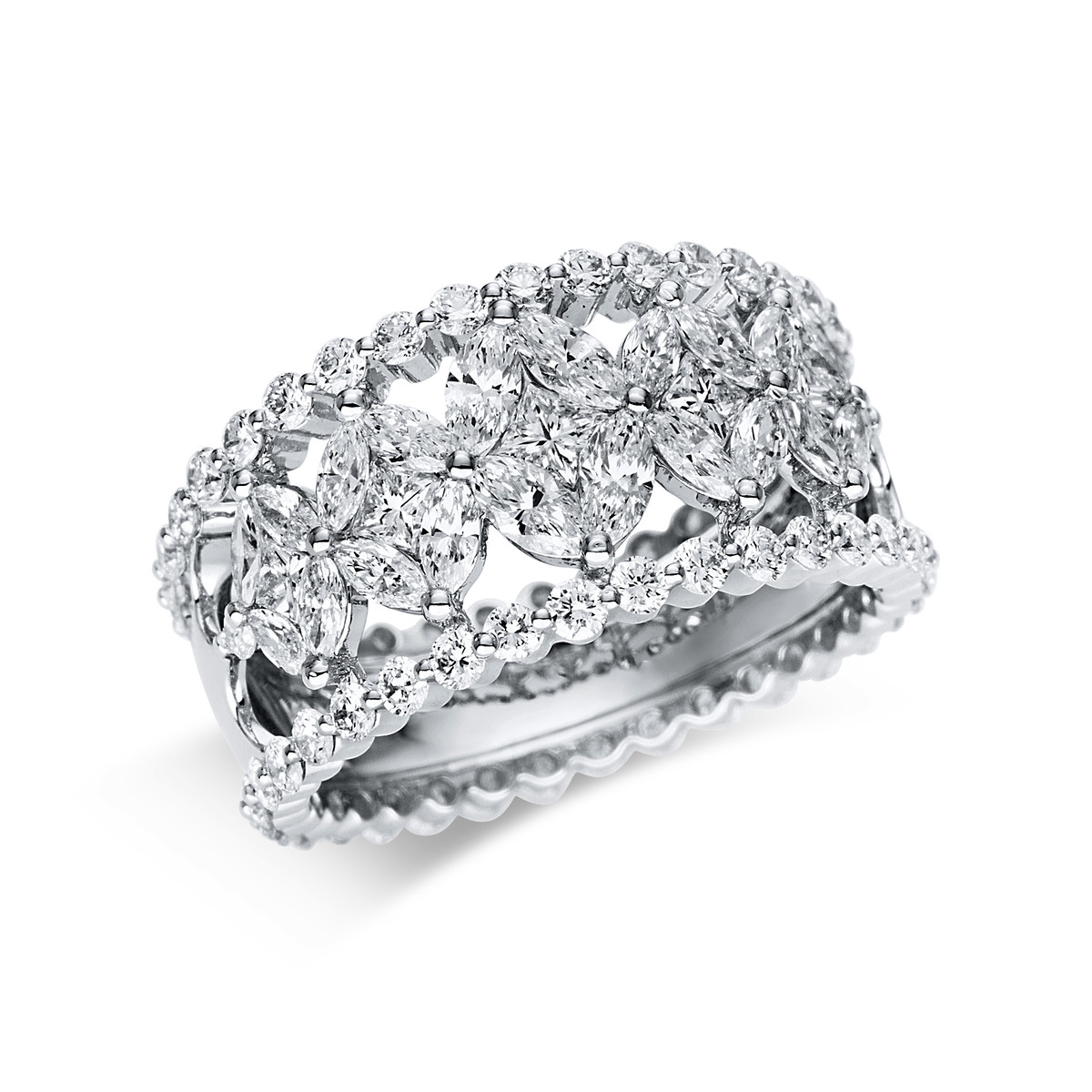 Ring 18 kt WG, 5 Princ. 0,29 ct, TW-si, 20 Navette 0,84 ct, TW-si, 70 Brillanten 1,26 ct, TW-si, Weite:54