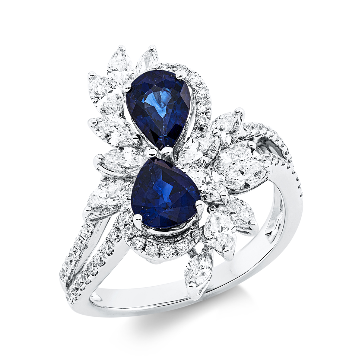 Ring 18 kt WG, 14 Navette 1,14 ct, F-vsi/si, 54 Brillanten 0,34 ct, F-vsi/si, 2 Saphire 1,81 ct blau, Weite:54