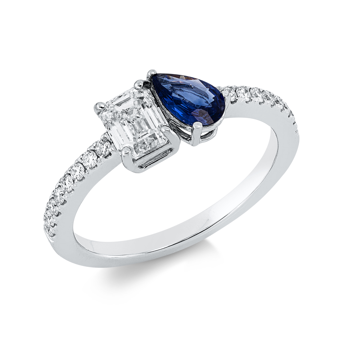 Ring 18 kt WG, 1 Sm.schliff 0,61 ct, TW-si, 16 Brillanten 0,16 ct, TW-si, 1 Saphir 0,32 ct blau, H:9,4 mm, B:6,2 mm, Weite:53
