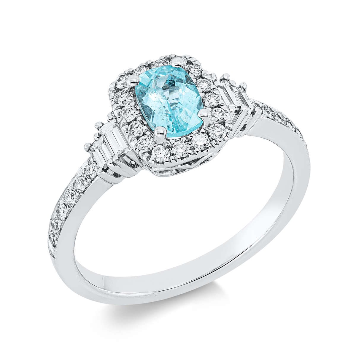 Ring 18 kt WG, 4 Baguette 0,15 ct, TW-si, 29 Brillanten 0,26 ct, TW-si, 1 Paraiba 0,76 ct blau, Weite:54