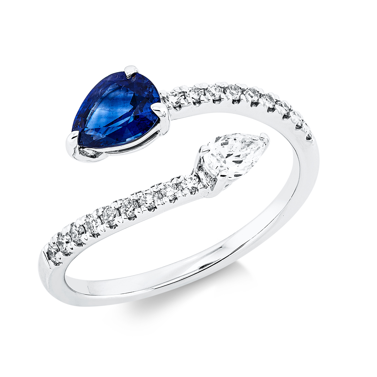 Ring 18 kt WG, 1 Tropfen 0,19 ct, TW-si, 18 Brillanten 0,16 ct, TW-si, 1 Saphir 0,78 ct blau, H:12,1 mm, B:9,4 mm, Weite:55