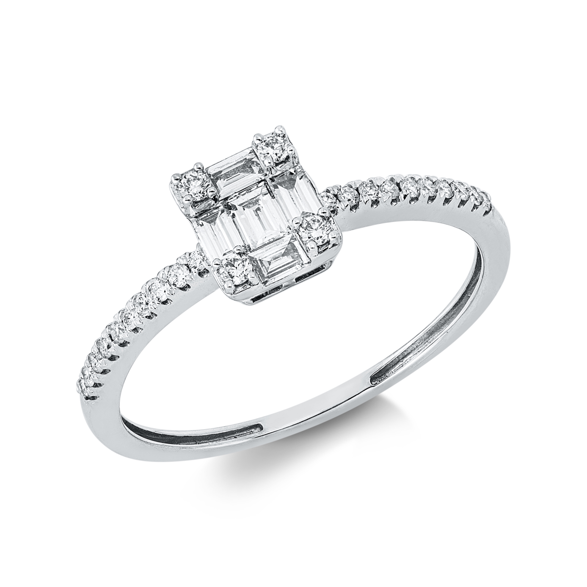 Ring 18 kt WG, 5 Baguette 0,18 ct, TW-si, 24 Brillanten 0,11 ct, TW-si, H:5,4 mm, B:6,2 mm, Weite:53