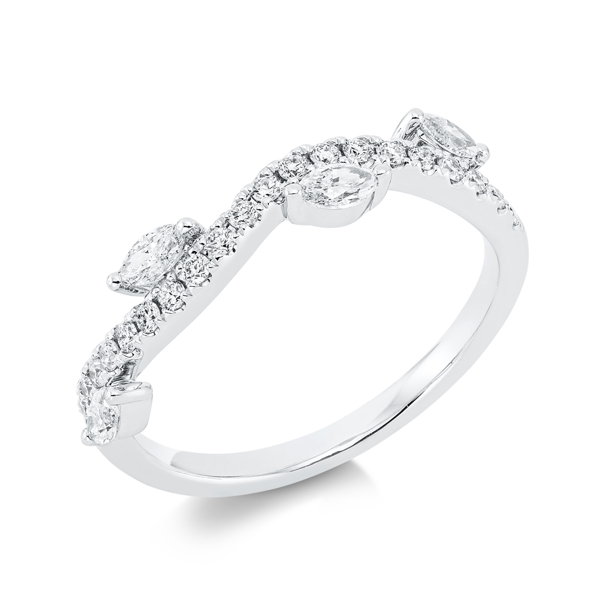 Ring 18 kt WG, 4 Navette 0,27 ct, TW-si, 21 Brillanten 0,20 ct, TW-si, Weite:53