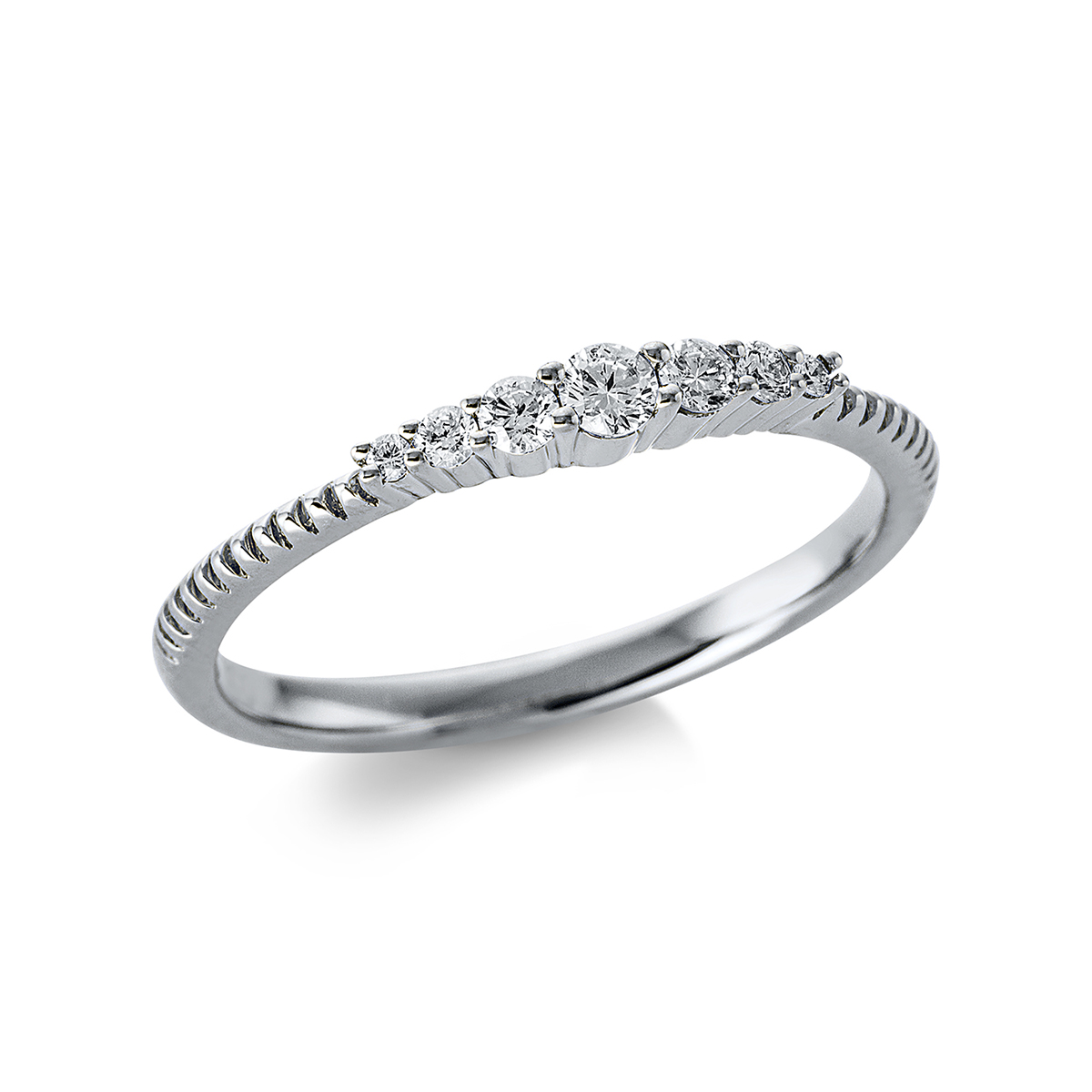 Ring 18 kt WG, 2 Brillanten 0,03 ct, TW-si, 2 Brillanten 0,05 ct, TW-si, 1 Brill. 0,07 ct, TW-si, 2 Brillanten 0,02 ct, TW-si, Weite:54