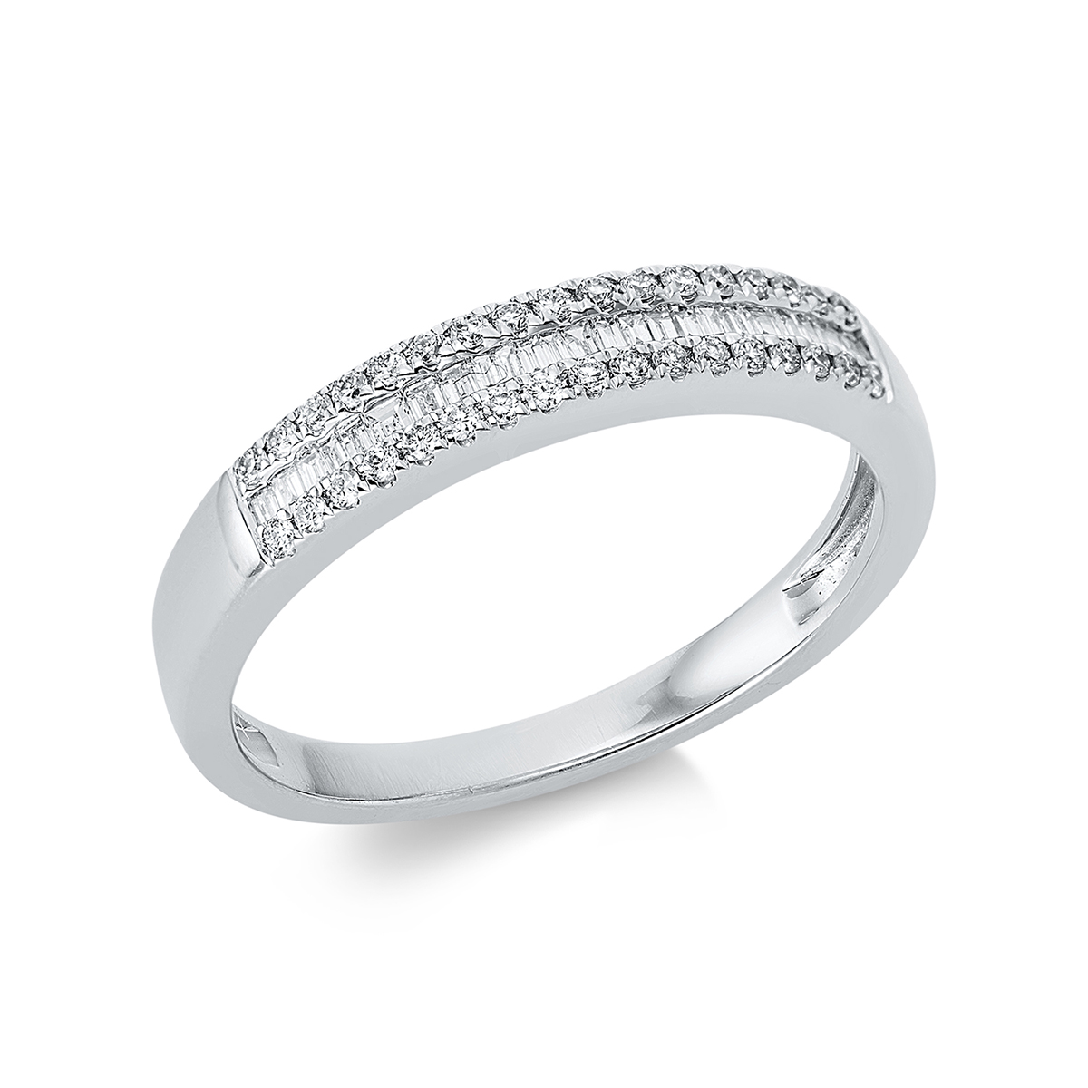 Ring 18 kt WG, 24 Baguette 0,11 ct, TW-si, 34 Brillanten 0,14 ct, TW-si, B:3,5 mm, Weite:54