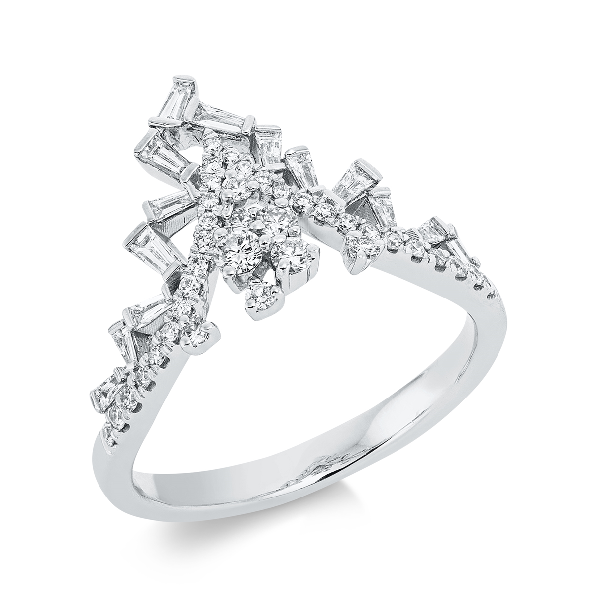 Ring 18 kt WG, 1 Brill. 0,05 ct, TW-si, 14 Trapeze 0,20 ct, TW-si, 36 Brillanten 0,26 ct, TW-si, B:13,3 mm, Weite:54