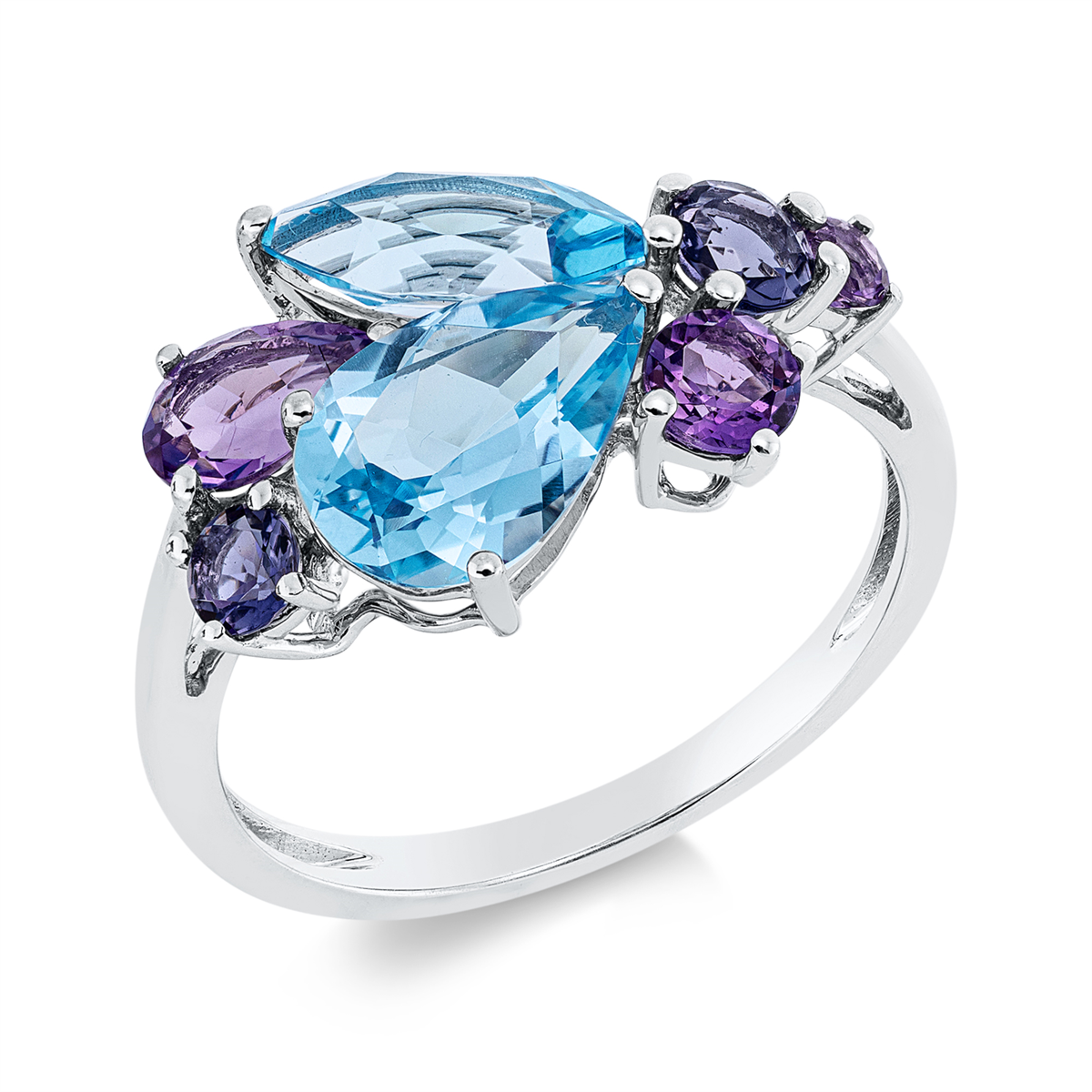 Ring 18 kt WG, 3 Amethyste 0,80 ct lila, 2 Topase 2,70 ct blau, 2 Iolith 0,30 ct blau, Weite:53