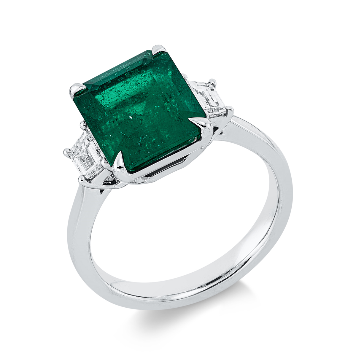 Ring 18 kt WG, 2 Trapeze 0,46 ct, F-vvs/vs, 1 Smaragd 4,01 ct grün, Weite:52