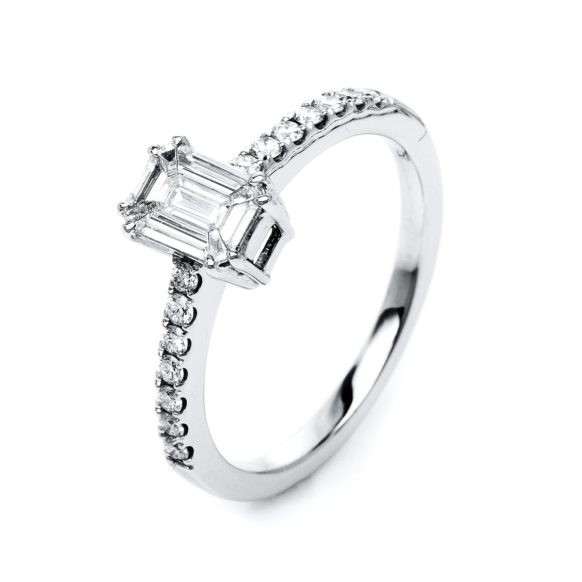 Ring 18 kt WG, 14 Brillanten 0,20 ct, TW-si, 9 Sm.schliff 0,31 ct, TW-si, H:7,3 mm, B:5,6 mm, Weite:54