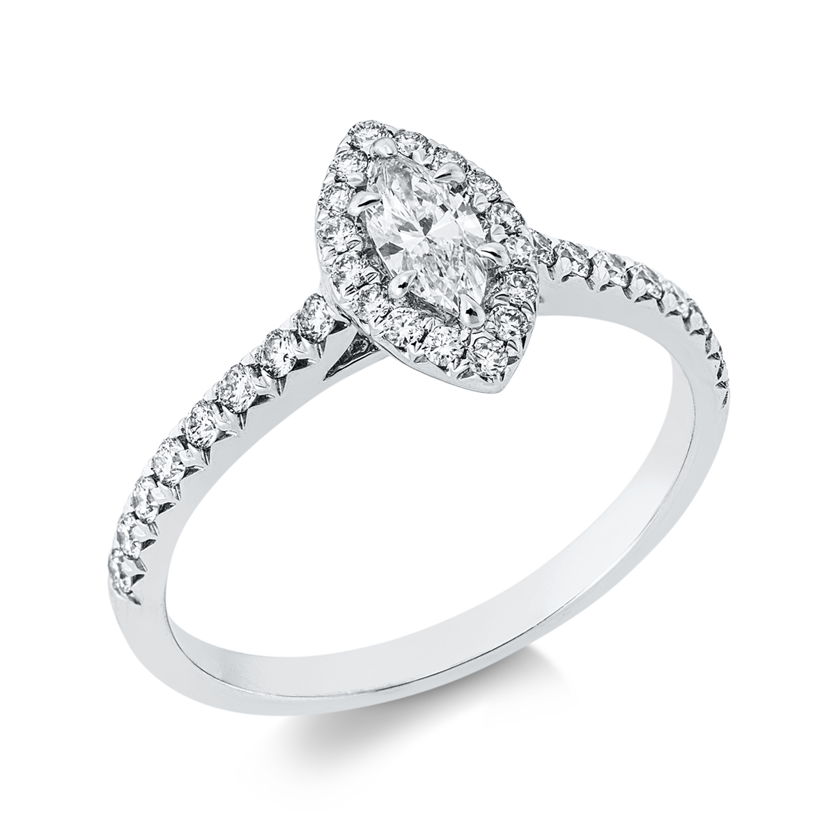 Ring 18 kt WG, 1 Navette 0,27 ct, TW-si, 32 Brillanten 0,34 ct, W-si, Weite:54