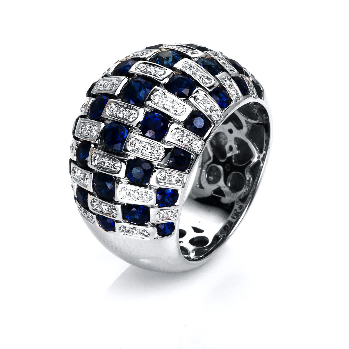 Ring 18 kt WG, 88 Brillanten 0,51 ct, TW-vsi, 33 Saphire 3,27 ct blau, Weite:54