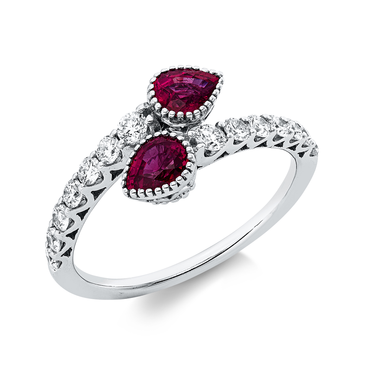Ring 18 kt WG, 14 Brillanten 0,51 ct, TW-si, 2 Rubine 0,96 ct rot, Weite:54