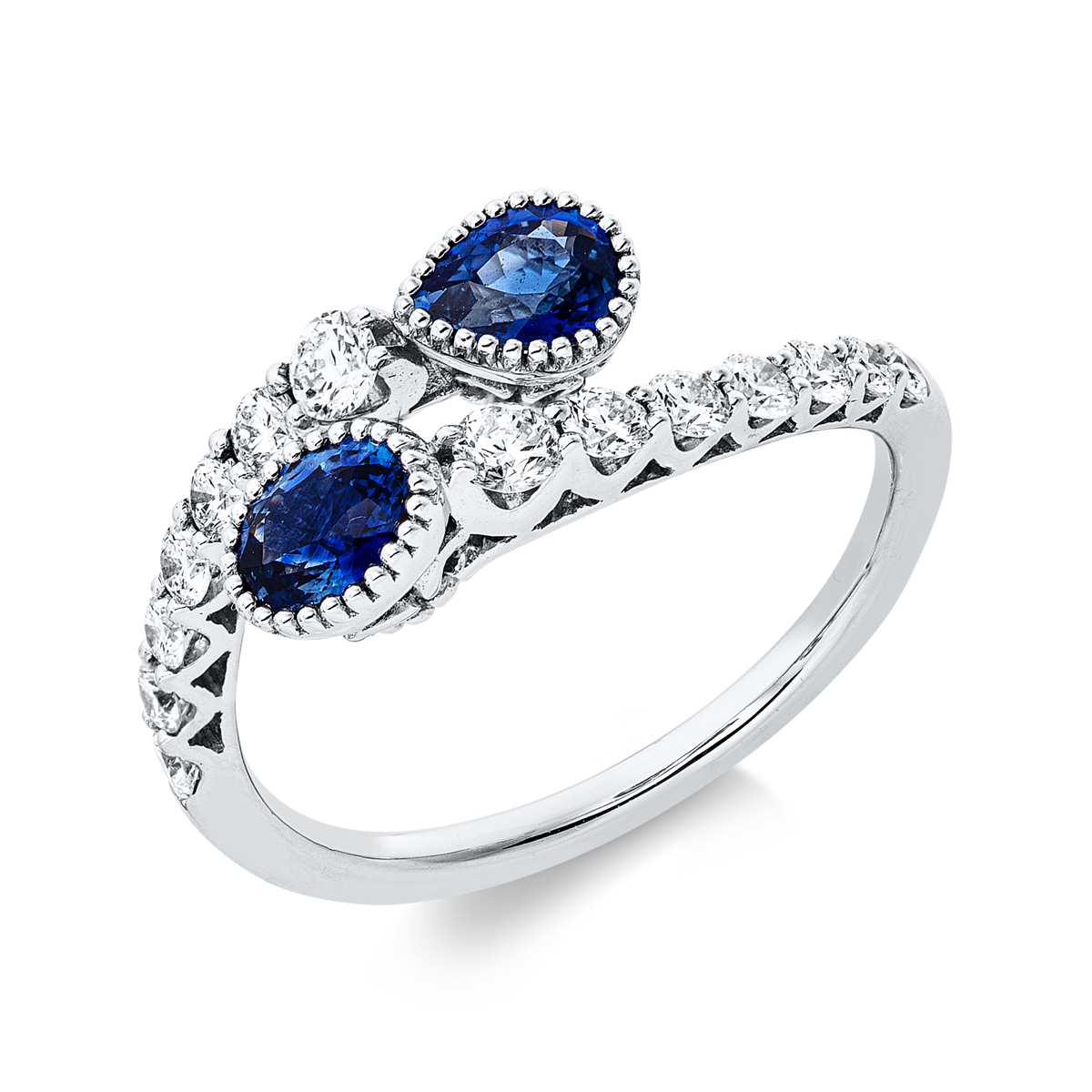 Ring 18 kt WG, 14 Brillanten 0,50 ct, TW-si, 1 Saphir 0,39 ct blau, 1 Saphir 0,37 ct blau, H:12,1 mm, B:7,0 mm, Weite:53