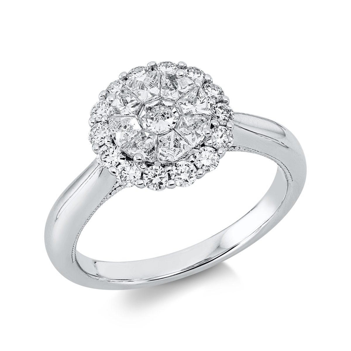 Ring 18 kt WG, 16 Brillanten 0,40 ct, TW-si, 9 Fant-Schl. 0,50 ct, TW-vsi, 8 Brillanten 0,04 ct, TW-si, Weite:53