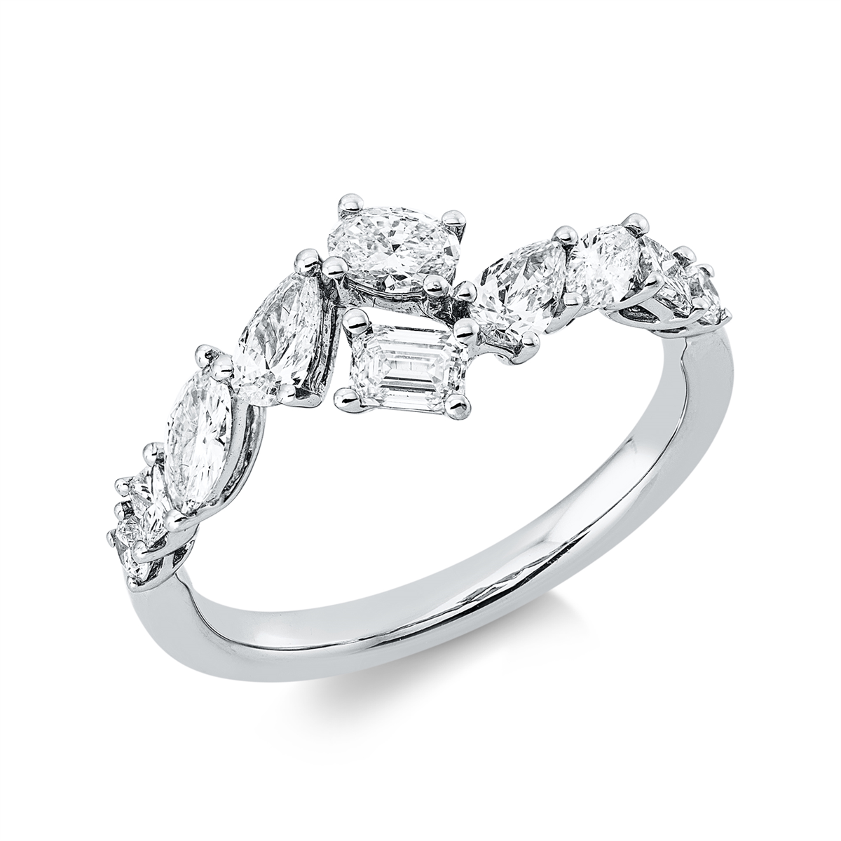 Ring 18 kt WG, 8 Fant-Schl. 0,90 ct, TW-si, 2 Brillanten 0,10 ct, TW-si, H:3,2 mm, B:4,2 mm, Weite:52
