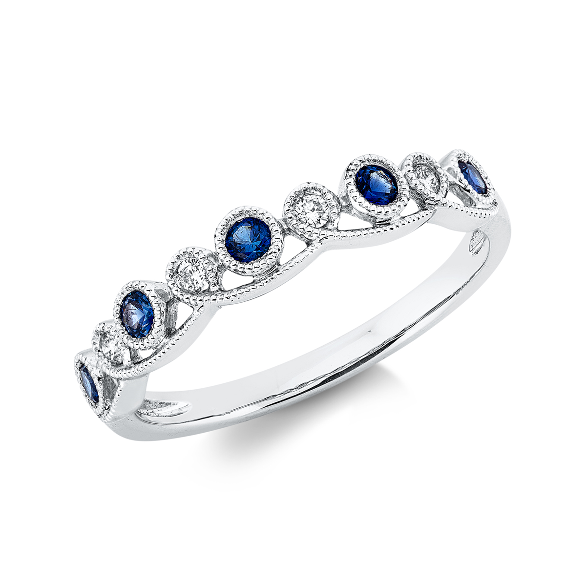Ring 18 kt WG, 4 Brillanten 0,05 ct, TW-si, 5 Saphire 0,20 ct blau, B:3,3 mm, Weite:52