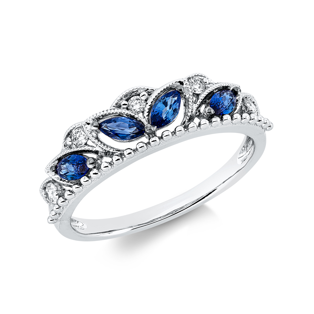 Ring 18 kt WG, 5 Brillanten 0,09 ct, TW-si, 4 Saphire 0,35 ct blau, Weite:51
