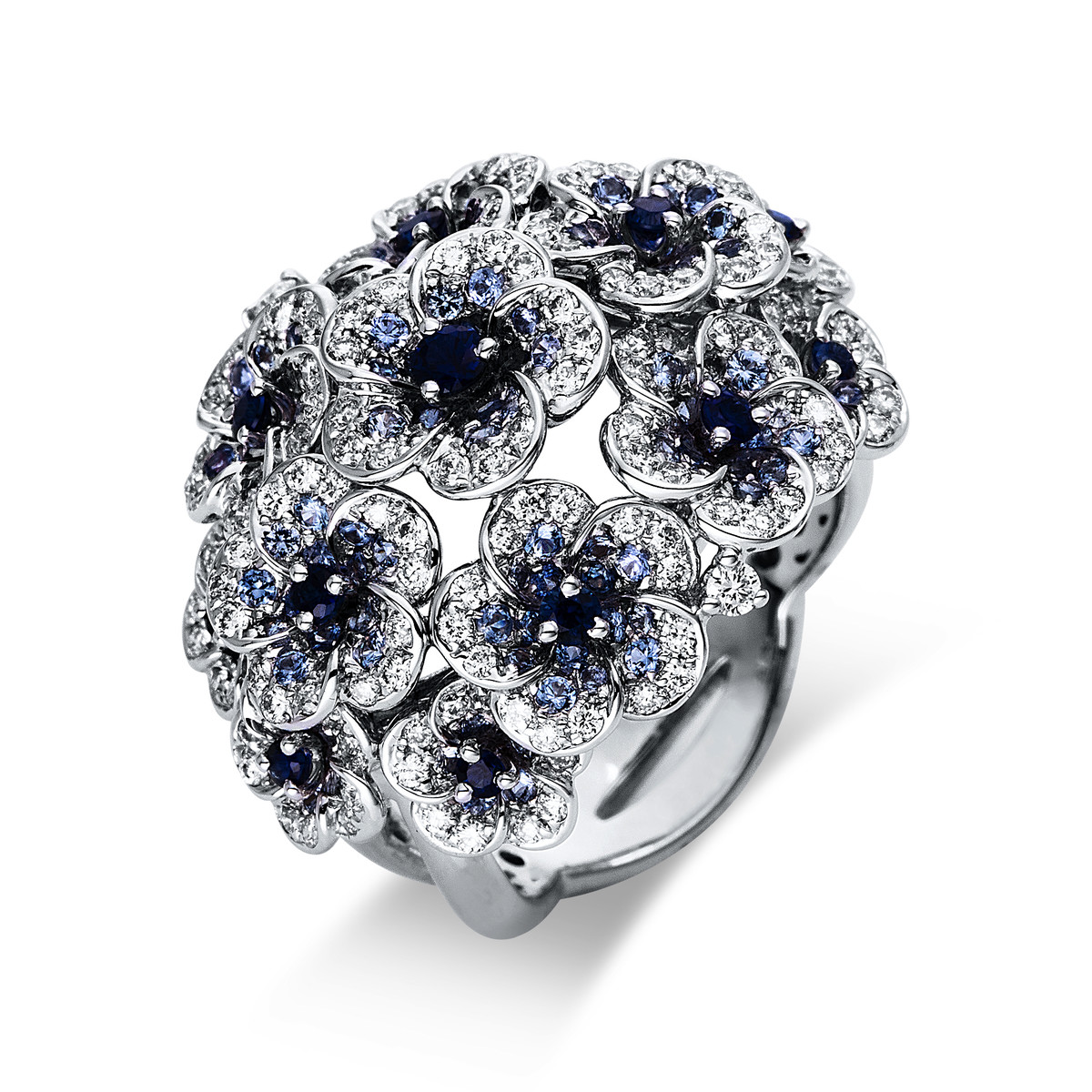 Ring 18 kt WG, 167 Brillanten 0,83 ct, TW-vsi/si, 148 Saphire 1,34 ct blau, Weite:53