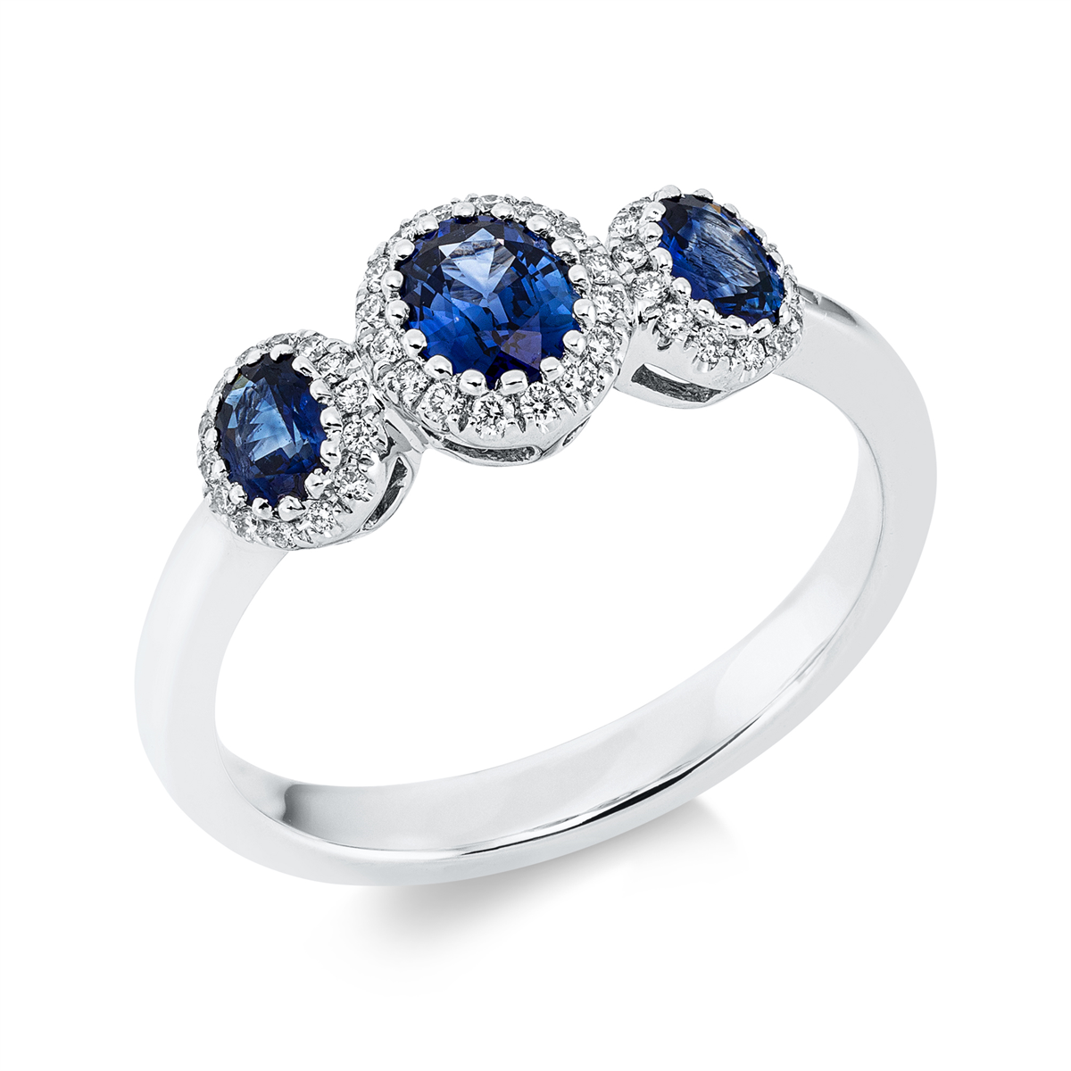 Ring 18 kt WG, 44 Brillanten 0,15 ct, TW-si, 3 Saphire 0,82 ct blau, Weite:53
