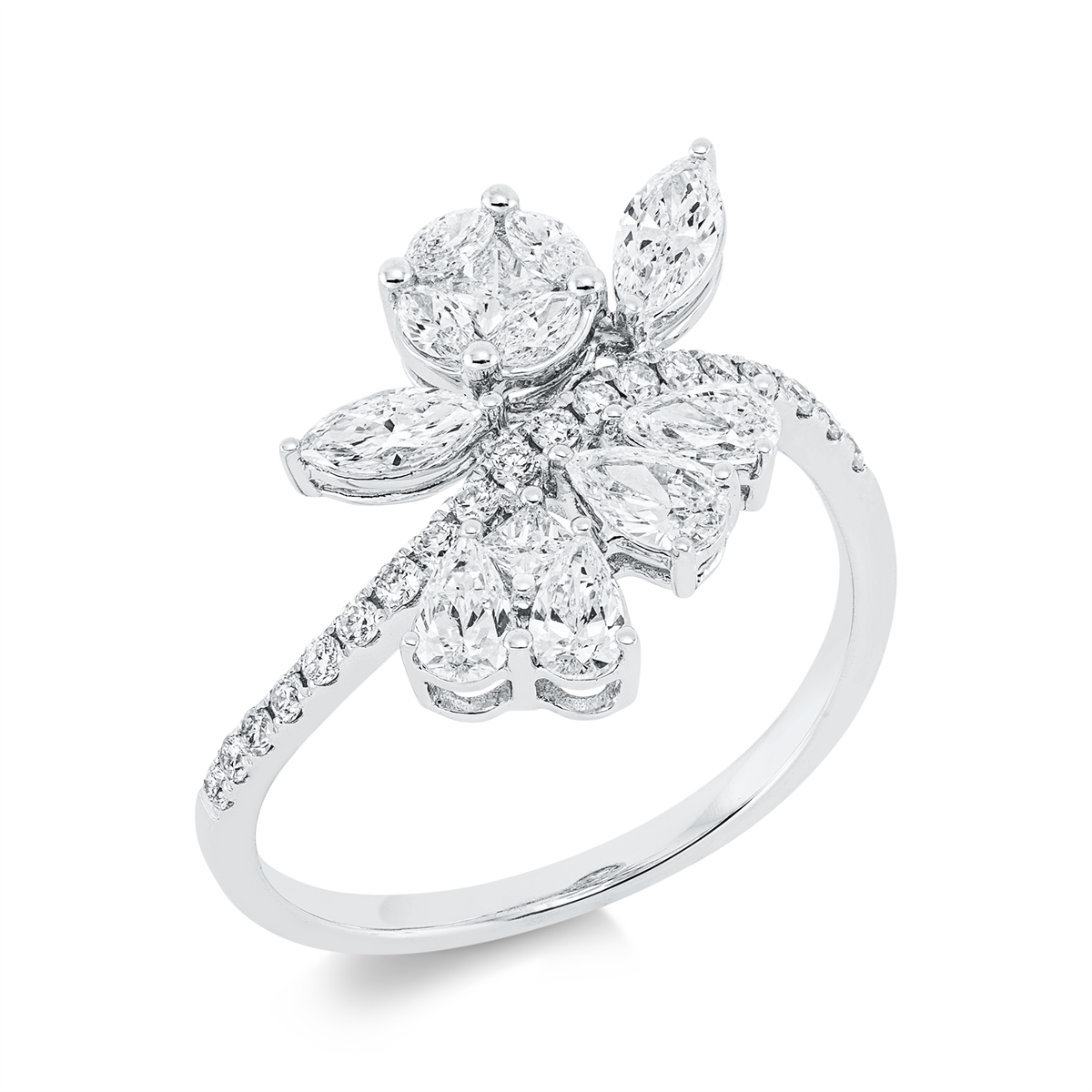 Ring 18 kt WG, 2 Princ. 0,11 ct, TW-si, 4 Tropfen 0,39 ct, TW-si, 6 Navette 0,35 ct, TW-si, 19 Brillanten 0,17 ct, TW-si, Weite:54