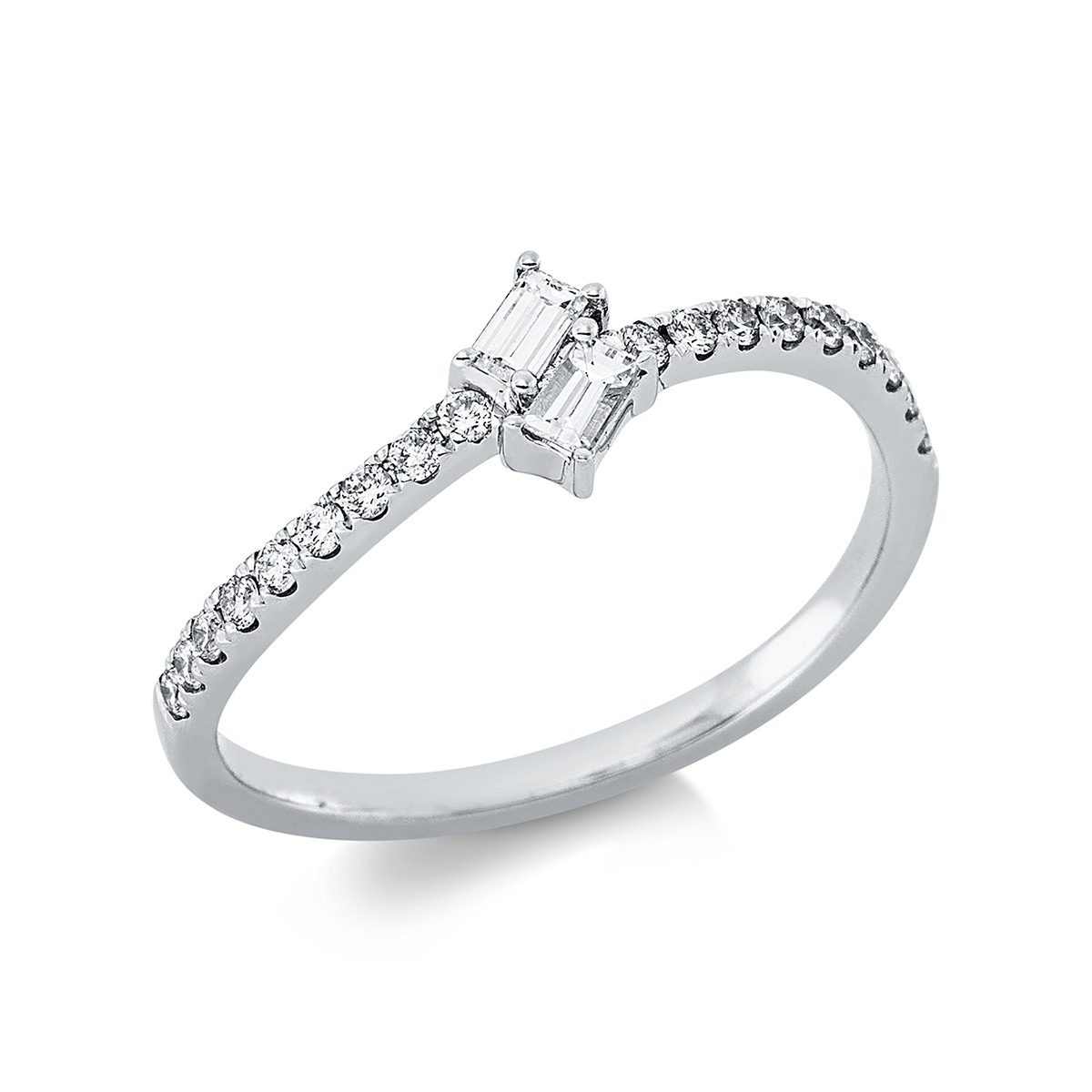 Ring 18 kt WG, 2 Baguette 0,09 ct, TW-si, 18 Brillanten 0,19 ct, TW-si, Weite:53