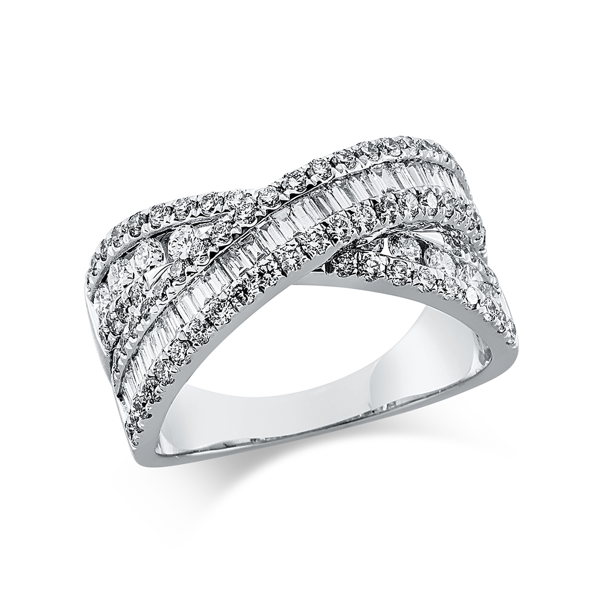 Ring 18 kt WG, 10 Brillanten 0,35 ct, TW-si, 27 Baguette 0,46 ct, TW-si, 70 Brillanten 0,68 ct, TW-si, Weite:54