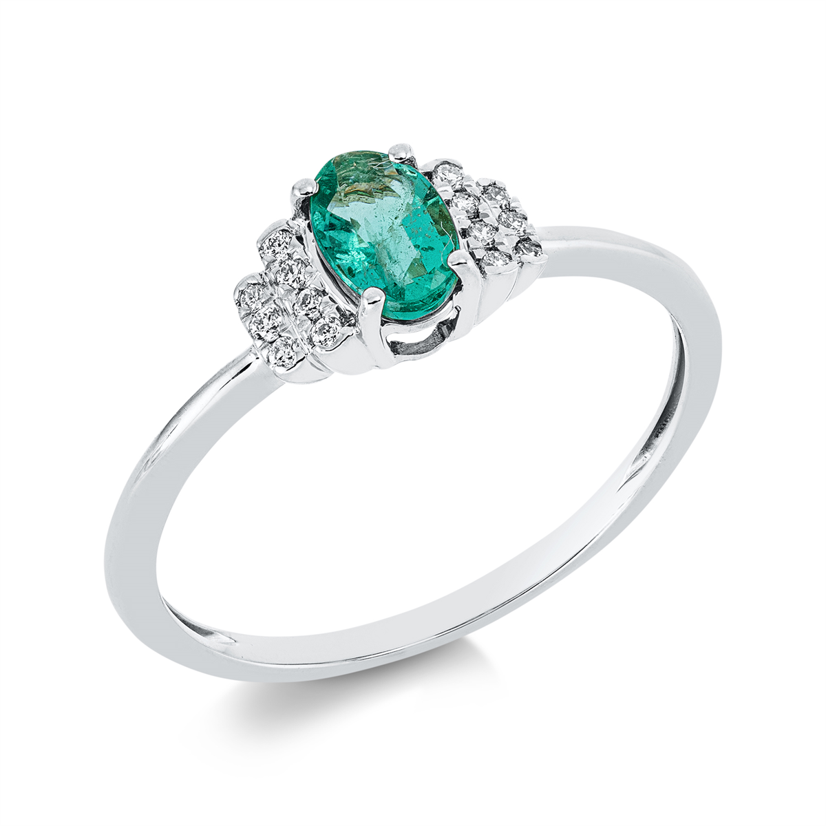 Ring 18 kt WG, 14 Brillanten 0,06 ct, TW-si, 1 Smaragd 0,62 ct grün, Weite:54