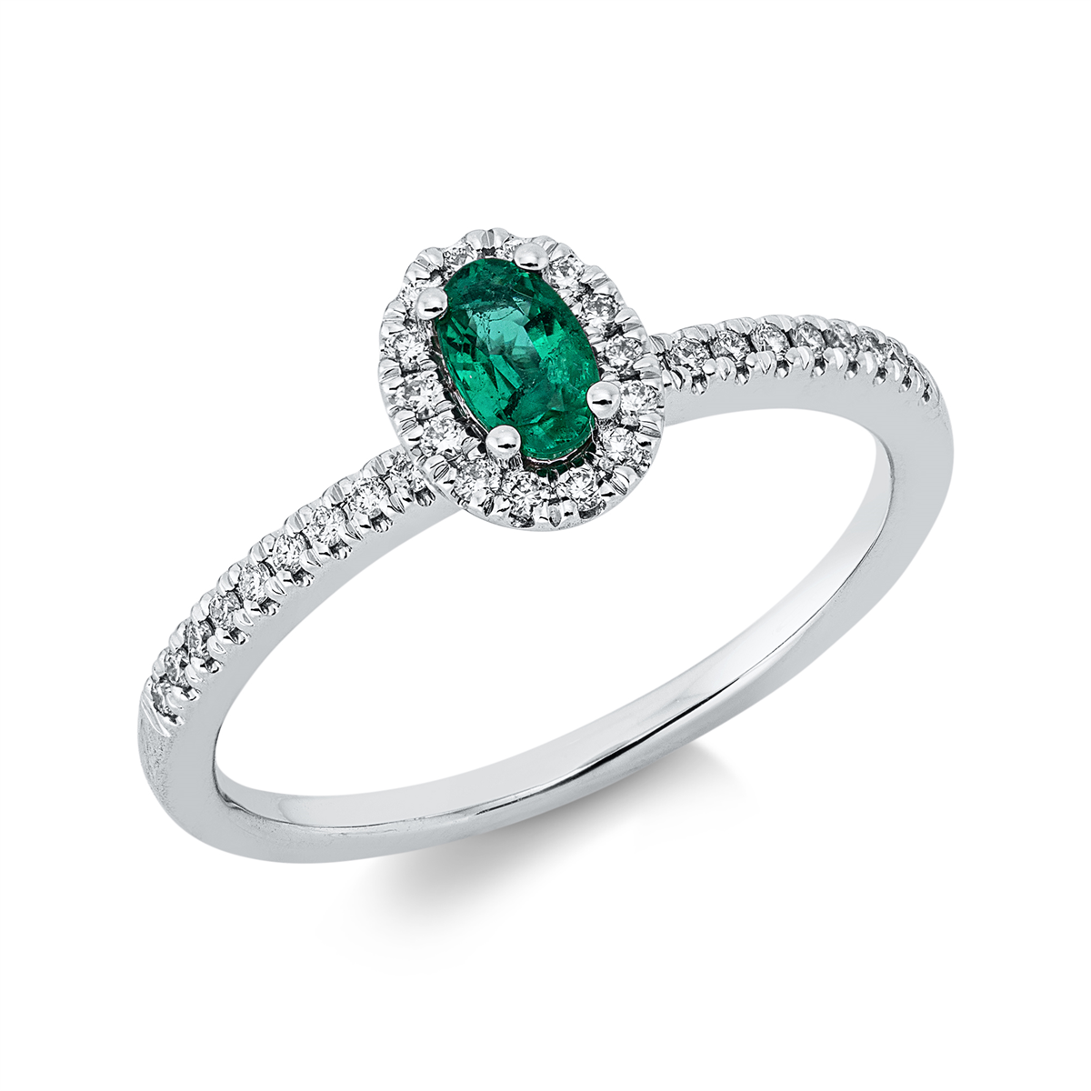 Ring 18 kt WG, 34 Brillanten 0,15 ct, TW-si, 1 Smaragd 0,21 ct grün, Weite:54