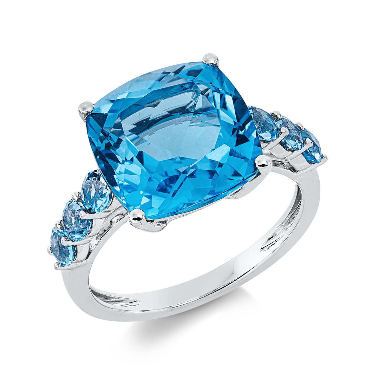 Ring 18 kt WG, 1 Topas 7,60 ct blau, 6 Topase 0,80 ct blau, H:10,8 mm, B:10,8 mm, Weite:53