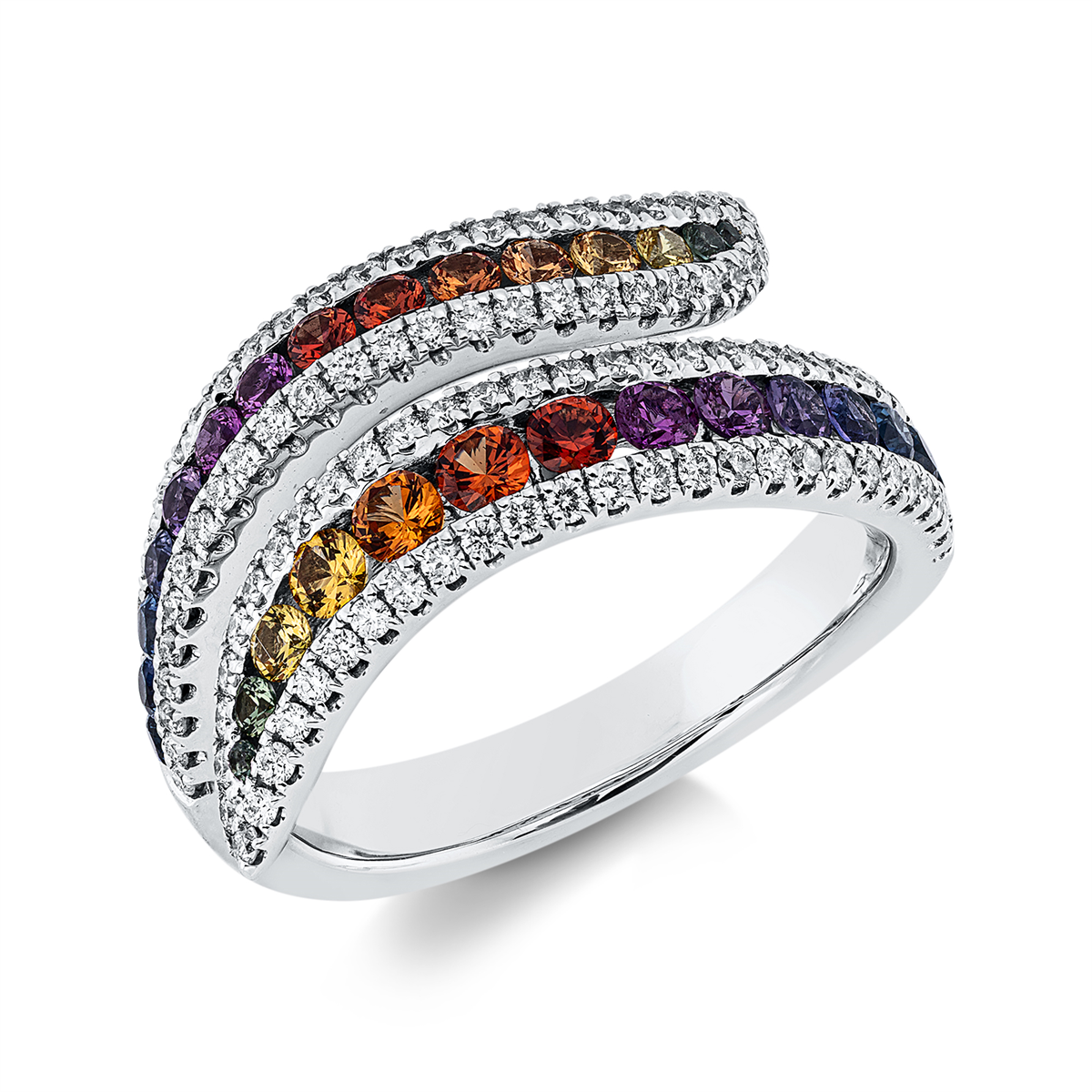 Ring 18 kt WG, 105 Brillanten 0,51 ct, TW-si, 29 Saphire 0,94 ct multicolor, Weite:53