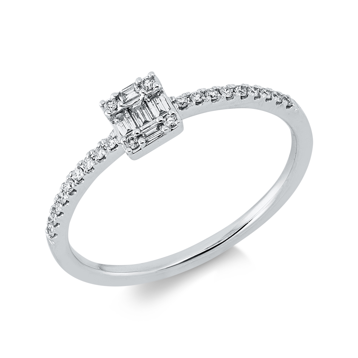 Ring 18 kt WG, 5 Baguette 0,06 ct, TW-si, 22 Brillanten 0,08 ct, TW-si, Weite:53