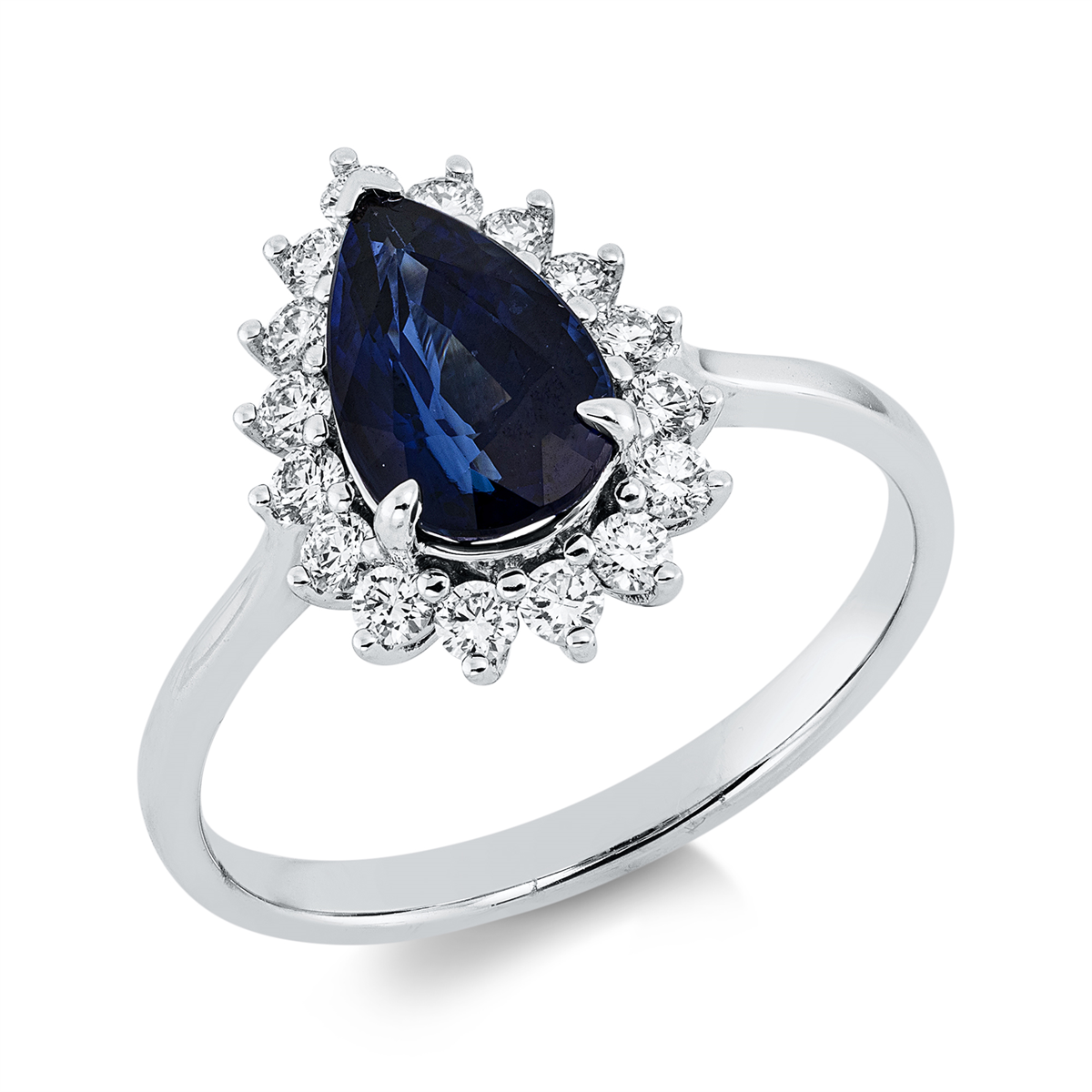 Ring 18 kt WG, 16 Brillanten 0,34 ct, TW-si, 1 Saphir 1,64 ct blau, Weite:53