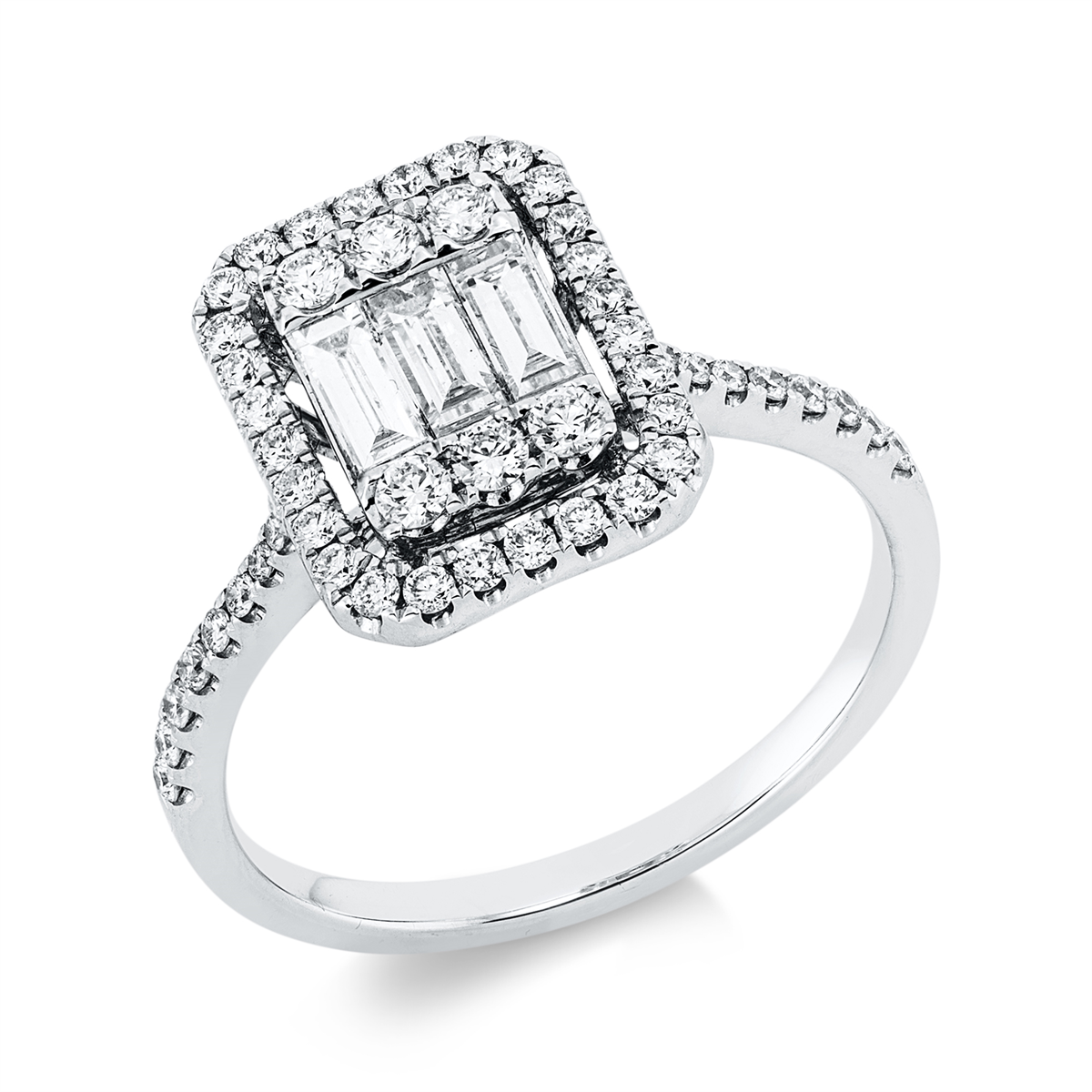 Ring 18 kt WG, 3 Baguette 0,37 ct, TW-vsi, 52 Brillanten 0,42 ct, TW-si, Weite:53,5