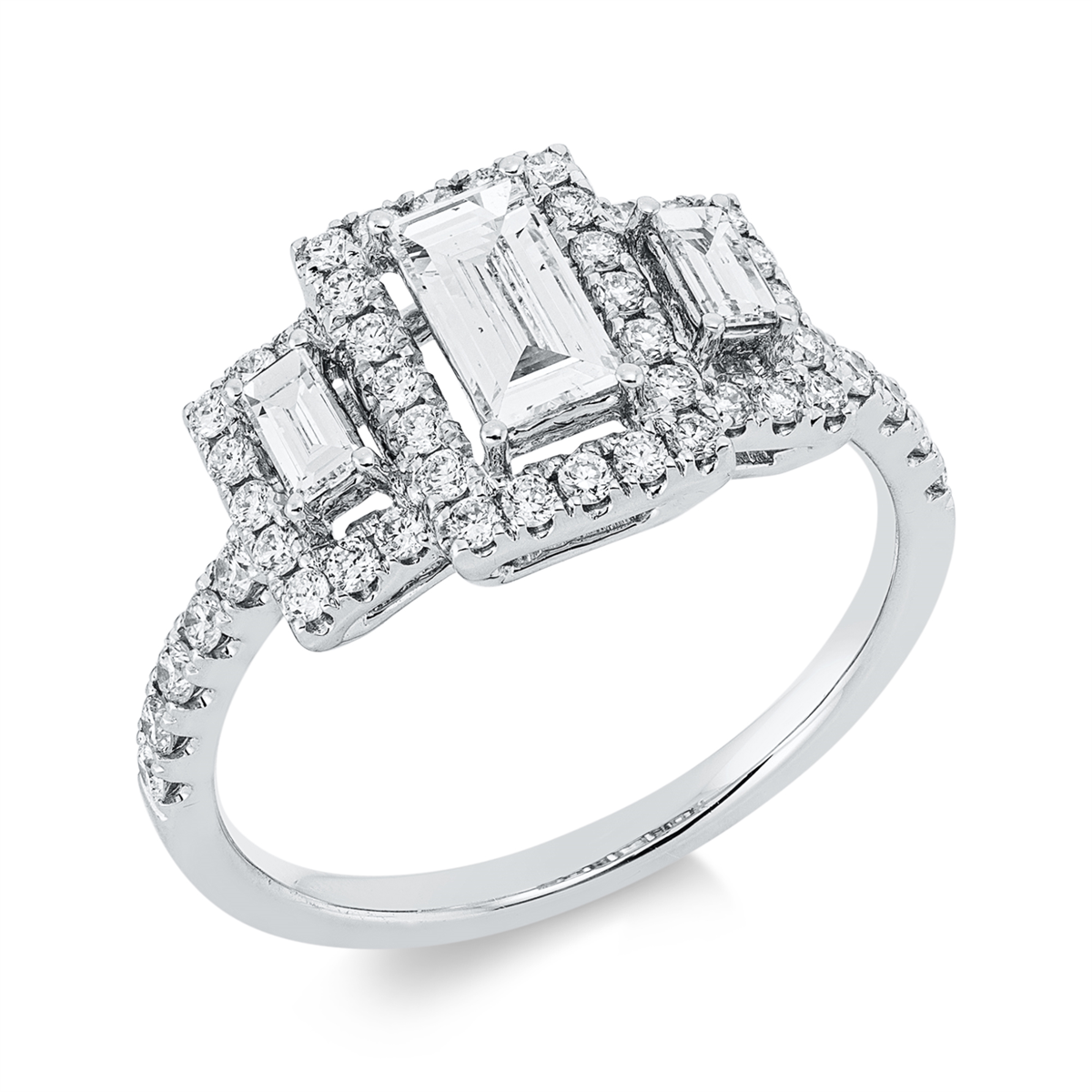 Ring 18 kt WG, 2 Baguette 0,16 ct, TW-vsi, 1 Bag. 0,33 ct, TW-vsi, 48 Brillanten 0,45 ct, TW-si, Weite:53,5
