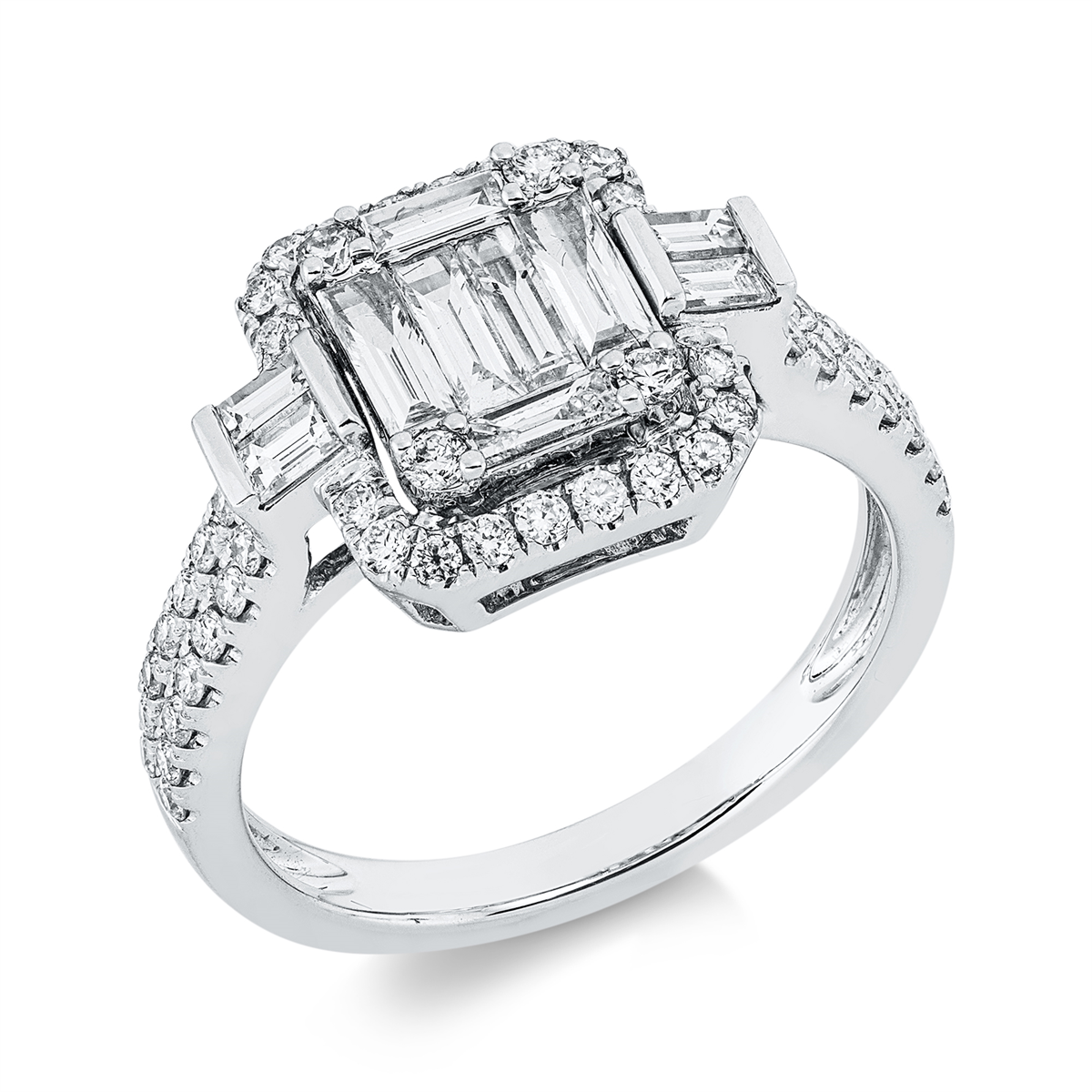 Ring 18 kt WG, 6 Baguette 0,23 ct, TW-vsi, 4 Baguette 0,37 ct, TW-vsi, 52 Brillanten 0,42 ct, TW-si, Weite:52