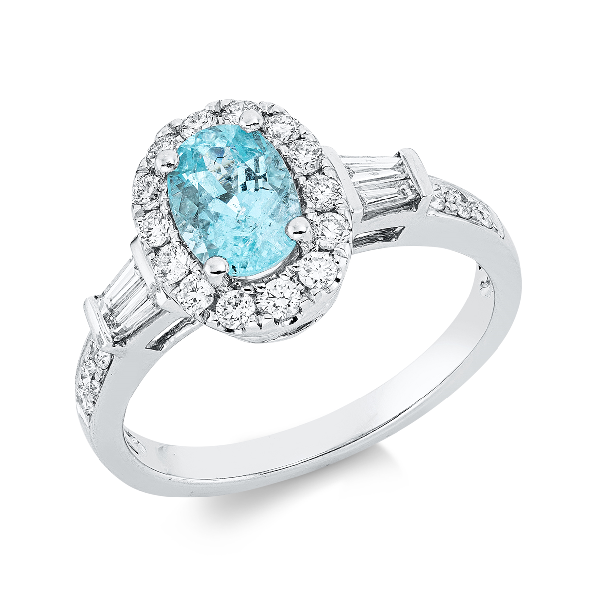Ring 18 kt WG, 4 Trapeze 0,18 ct, TW-si, 20 Brillanten 0,36 ct, TW-si, 1 Paraiba 0,94 ct blau, Weite:54