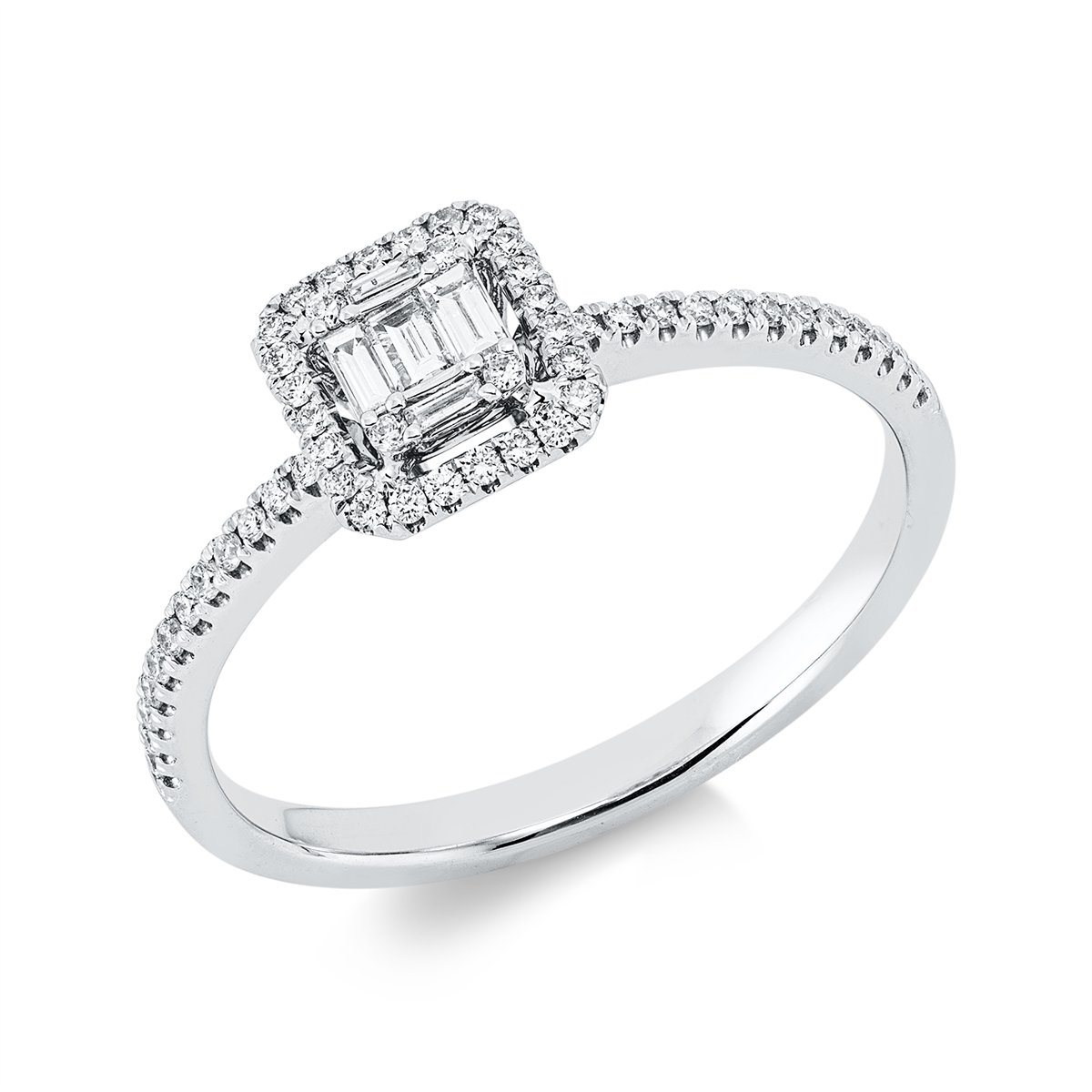 Ring 18 kt WG, 5 Baguette 0,09 ct, TW-vsi, 52 Brillanten 0,16 ct, TW-si, H:6,5 mm, B:7,0 mm, Weite:54