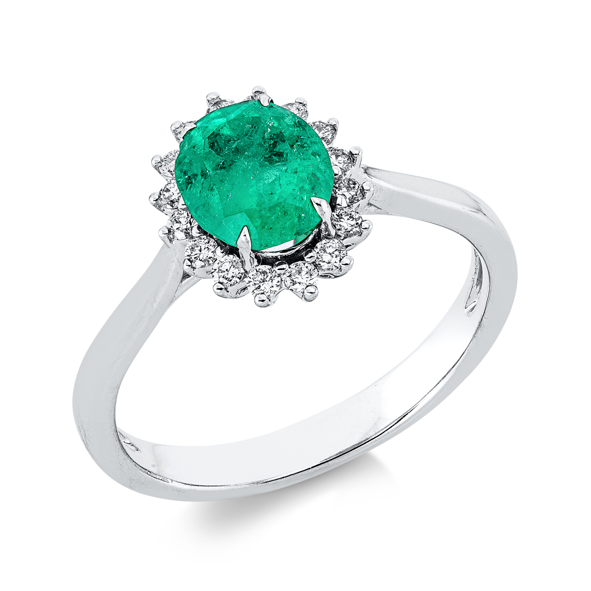 Ring 18 kt WG, 16 Brillanten 0,18 ct, TW-si, 1 Smaragd 1,12 ct grün, Weite:54