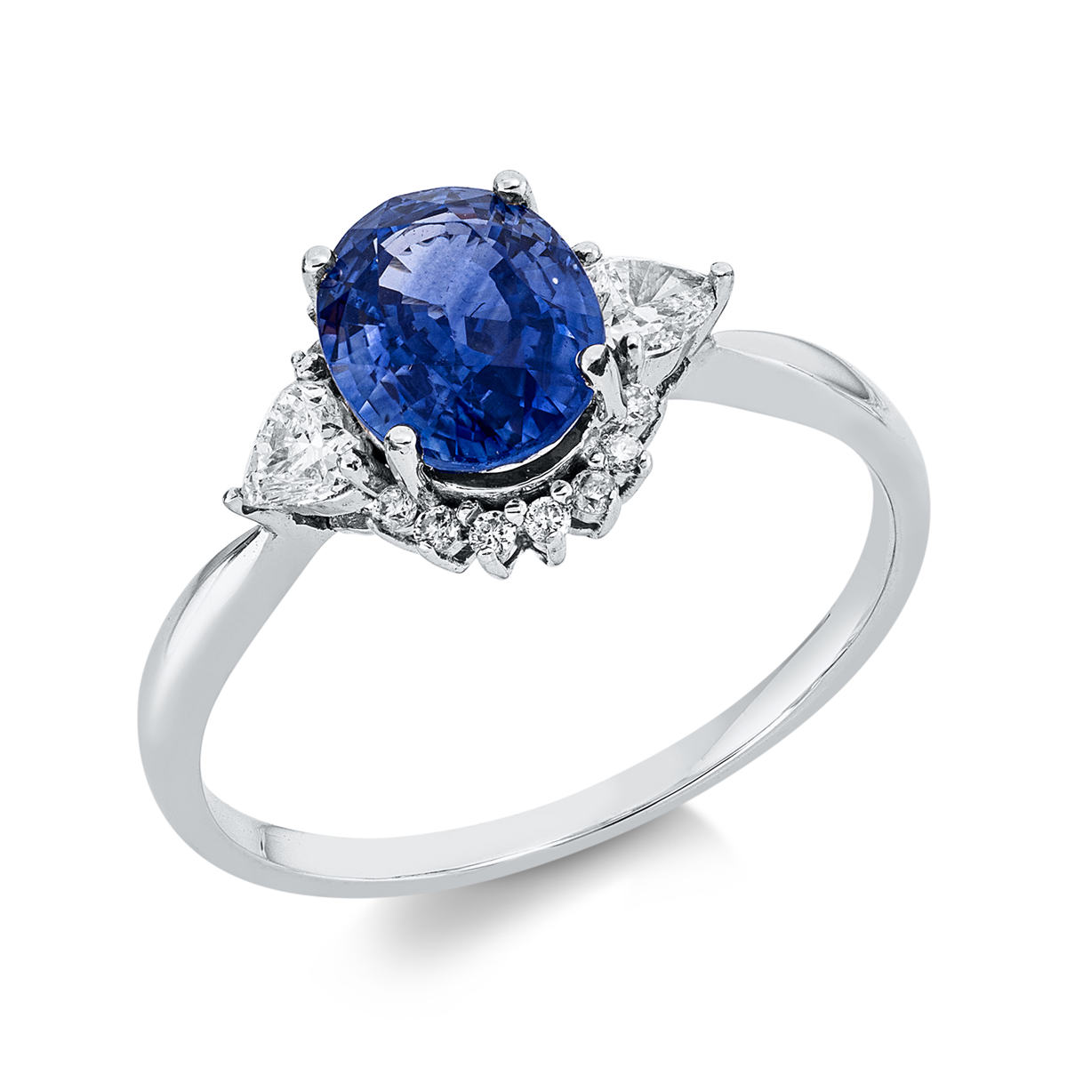 Ring 18 kt WG, 2 Herzschl. 0,22 ct, F-vsi, 16 Brillanten 0,08 ct, TW-si, 1 Saphir 1,85 ct blau, Weite:53