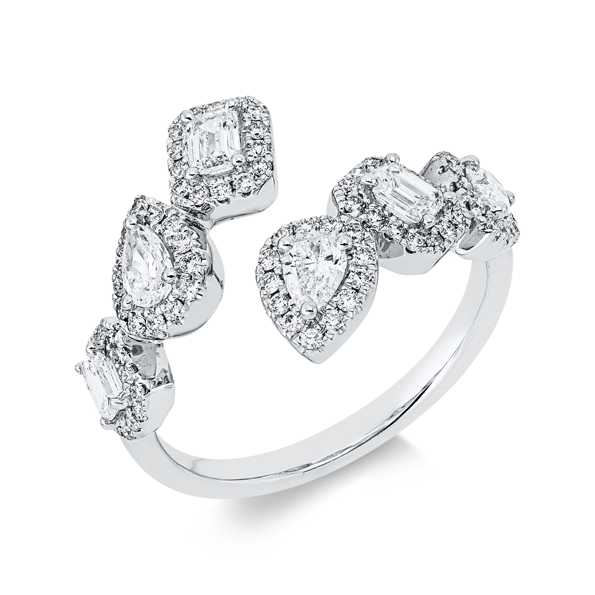 Ring 18 kt WG, 3 Sm.schliff 0,36 ct, TW-vsi, 3 Tropfen 0,39 ct, TW-si, 81 Brillanten 0,35 ct, TW-si, Weite:53