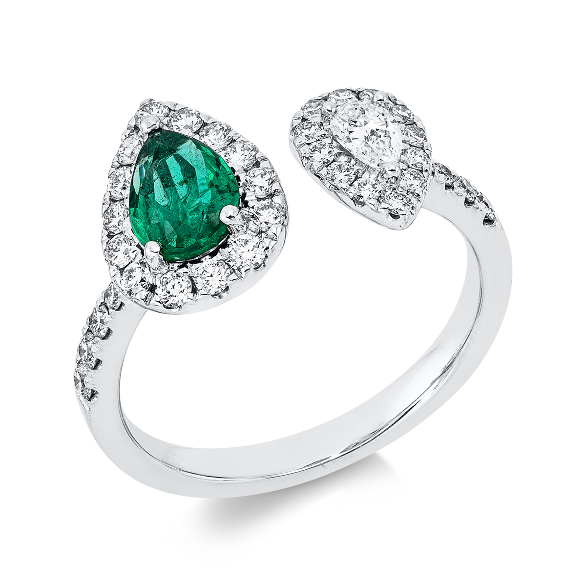 Ring 18 kt WG, 1 Tropfen 0,15 ct, TW-si, 35 Brillanten 0,44 ct, TW-si, 1 Smaragd 0,52 ct grün, Weite:53