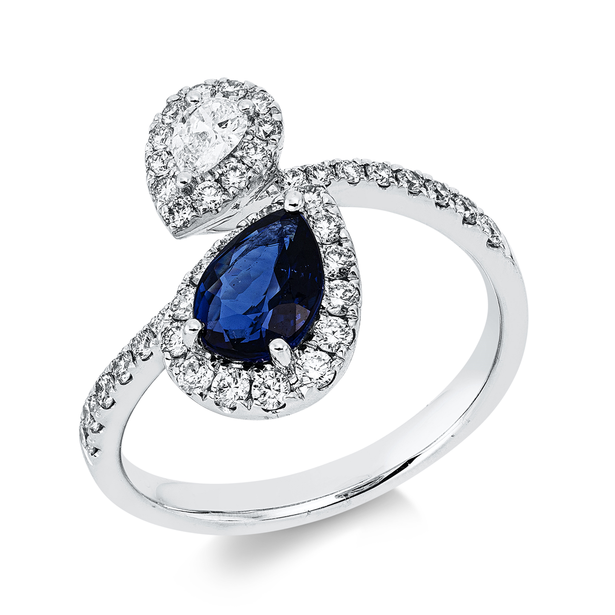Ring 18 kt WG, 1 Tropfen 0,13 ct, TW-si, 41 Brillanten 0,50 ct, TW-si, 1 Saphir 1,09 ct blau, Weite:53