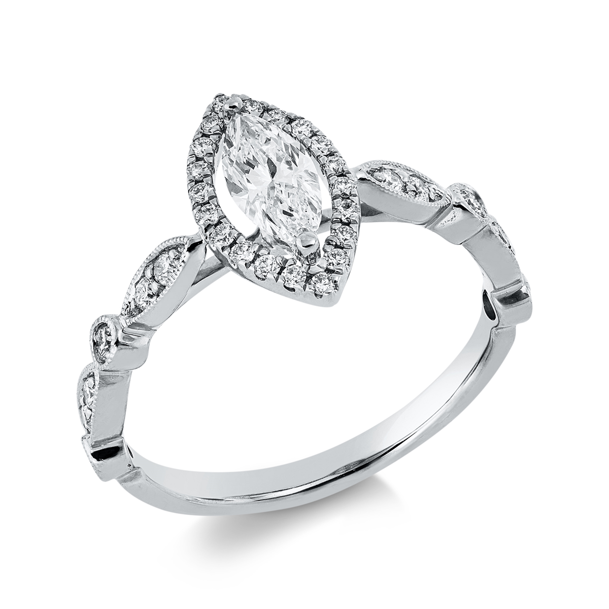 Ring 18 kt WG, 1 Navette 0,40 ct, TW-si, 32 Brillanten 0,27 ct, TW-si, H:6,7 mm, B:12,1 mm, Weite:53