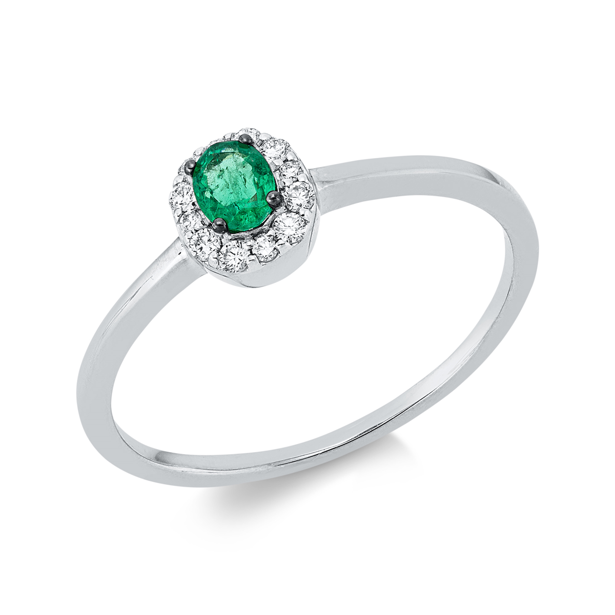 Ring 18 kt WG, Fassung teils schwarz rhodinie, 12 Brillanten 0,08 ct, TW-si, 1 Smaragd 0,18 ct grün, Weite:54