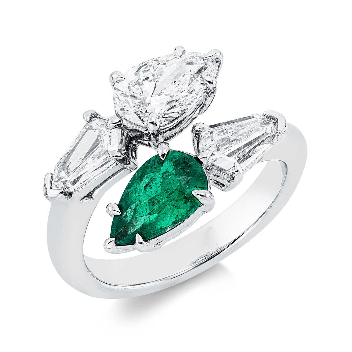 Ring 18 kt WG, GIA 2497909823, 2 Fant-Schl. 1,02 ct, TW-vsi/si, 1 Tropfen 1,01 ct, TW-if, 1 Smaragd 0,86 ct grün, Weite:52