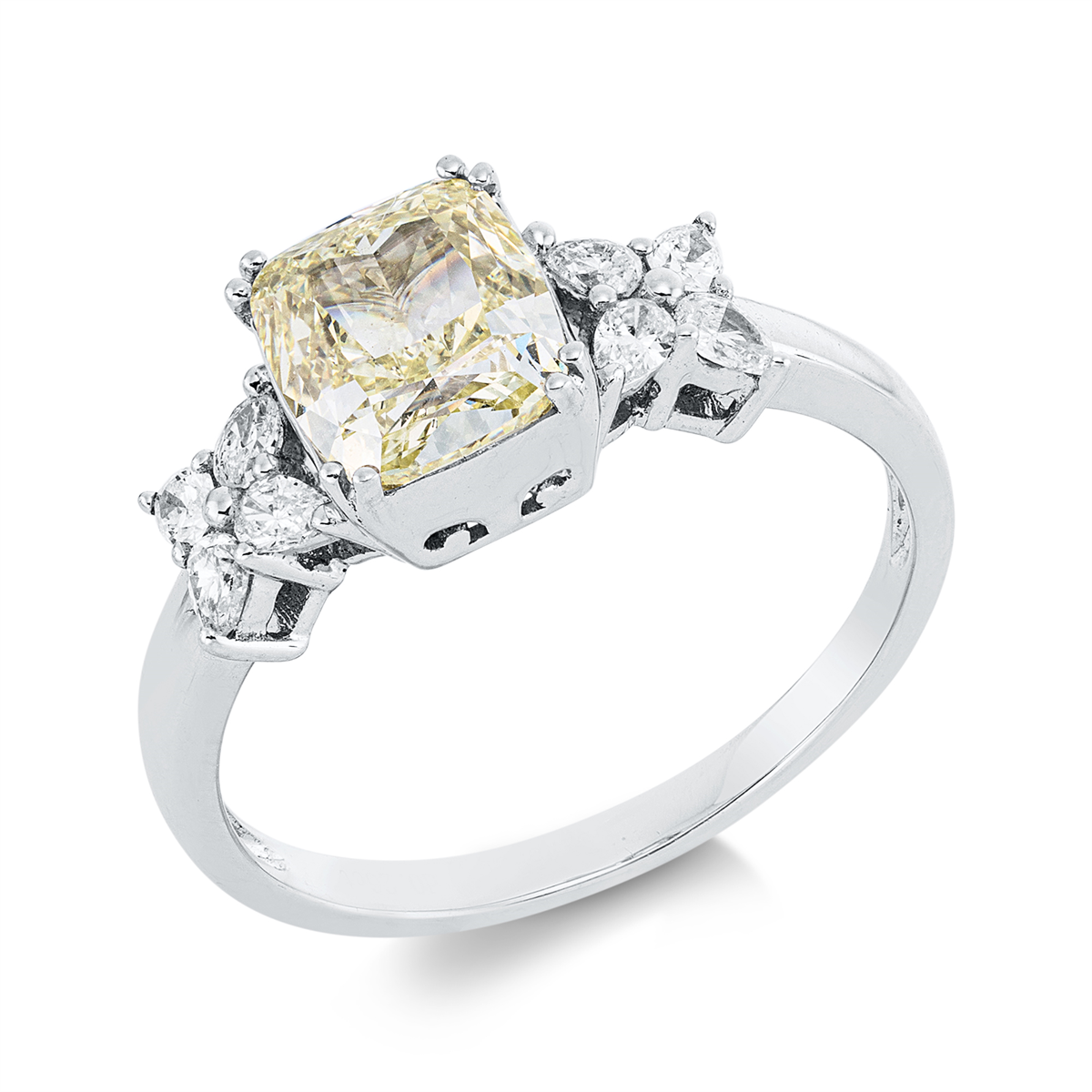Ring 18 kt WG, GIA5172321132, 1 Cushion 1,58 ct, gelb-vsi, 8 Tropfen 0,26 ct, TW-si, H:14,1 mm, B:7,0 mm, Weite:52