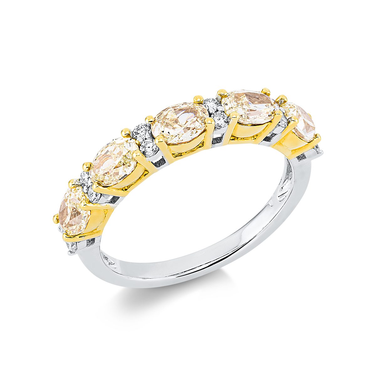 Ring 18 kt WG+GG, 12 Brillanten 0,17 ct, TW-si, 5 Oval 1,50 ct, gelb, Weite:53