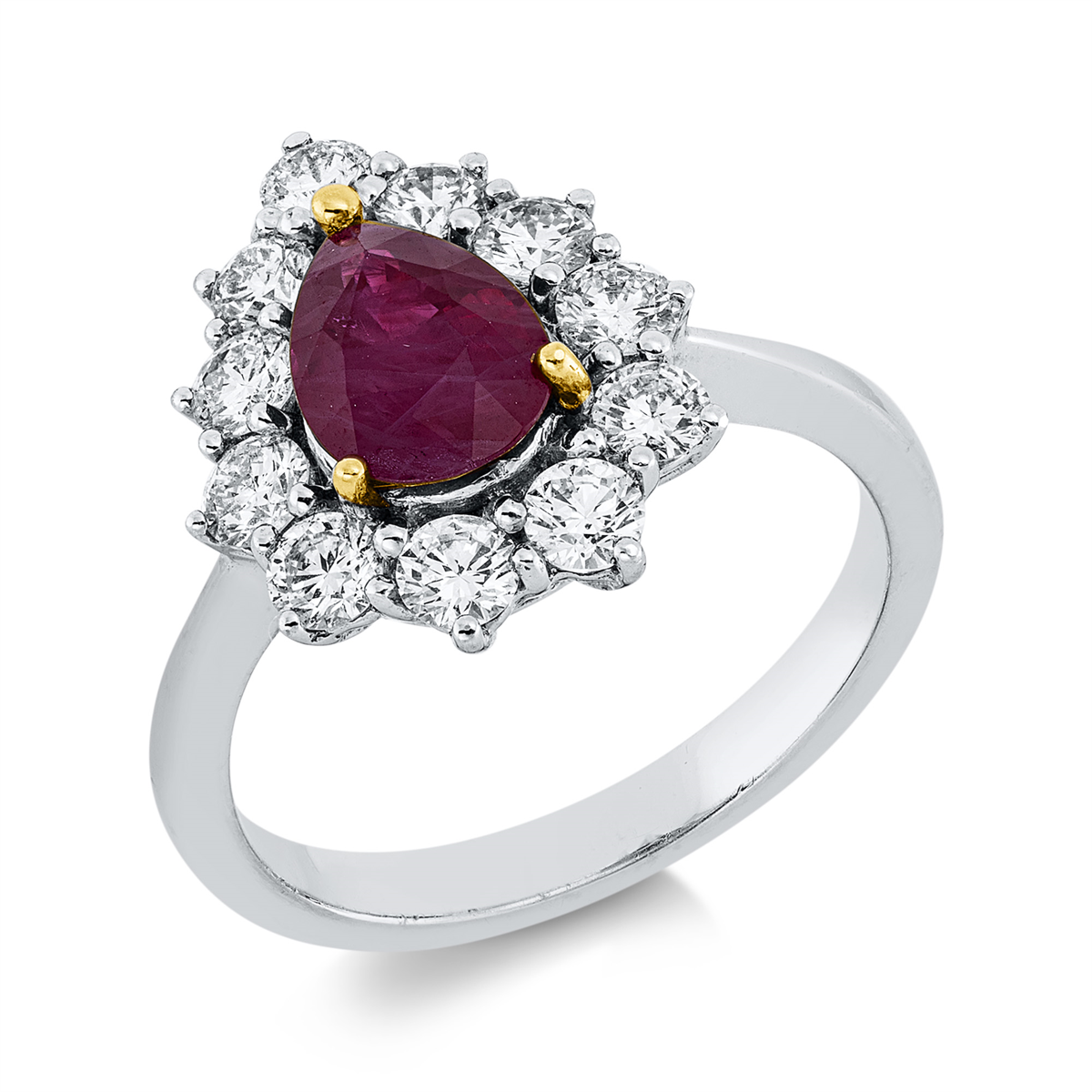 Ring 18 kt WG+GG, 11 Brillanten 0,96 ct, TW-si, 1 Rubin 1,32 ct rot, Weite:53